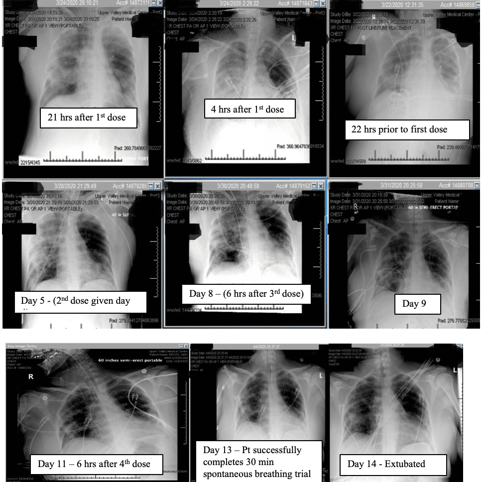 It is also critical to point out that the patient was intubated and almost died while on hydroxychloroquine chronically and did not clinically improve with the concomitant administration of azithromycin. It was not until eculizumab was delivered that the patient began to improve (see chest x-ray for hours after the first dose). The patient also continued to improve despite hydroxychloroquine being stopped by the infectious disease consultant due to a concern for anemia.